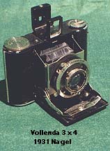 Back in the Depression again, several other German manufacturers did see some success with #127 roll film in more traditional folding camera styles, but not without the occasional unusual feature to gain the public's attention. For example, Foth & Company sought to emulate the sudden success of the Leica 35mm camera when it introduced its Derby camera in 1930 boasting a cloth focal plane shutter and speeds up to 1/500 of a second. Oddly, the rare original model produced images only 24 x 36 millimeters on #127 roll film, the exact same dimensions as a standard 35mm frame! The potential advantage of #127's larger format was therefore lost! The improved version of the Derby in 1931, however, fixed this shortcoming by expanding the film plane to 3 x 4 centimeter half-frame format. But despite its own very adequate Foth Anastigmat lens, it could also be ordered with a Leitz Elmar lens identical to that found on the Leica camera. This was a roll film camera with a serious 35mm identity crisis! They even stocked a special model covered in "lizard skin" rather than leather, similar in effect to the rare Leica Luxus!! Still, the Foth Derby had a distinctive pop-out bellows, later came with a selection of odd rangefinding devices, and managed to survive until about 1942. Amidst all the variations and confusion, I would hazard to say that a clean basic model would cost a collector about $75, while adding a weird lens or weird format or weird anything else would probably double that price.
