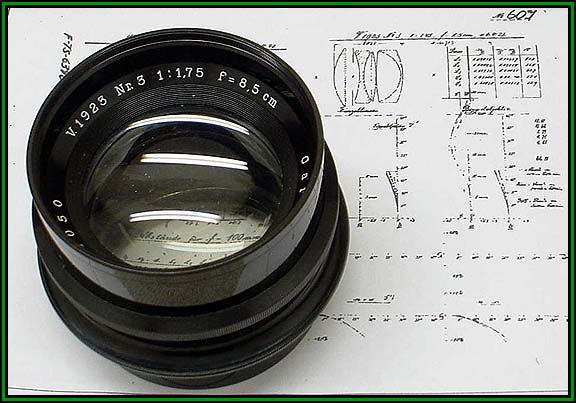An impressive Carl Zeiss Versuch or experimental prototype lens, dating from 1925, representing an 8.5cm design with fast f/1.75 maximum aperture, sitting on a copy of the original Zeiss data and test results card.